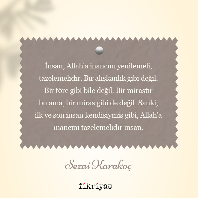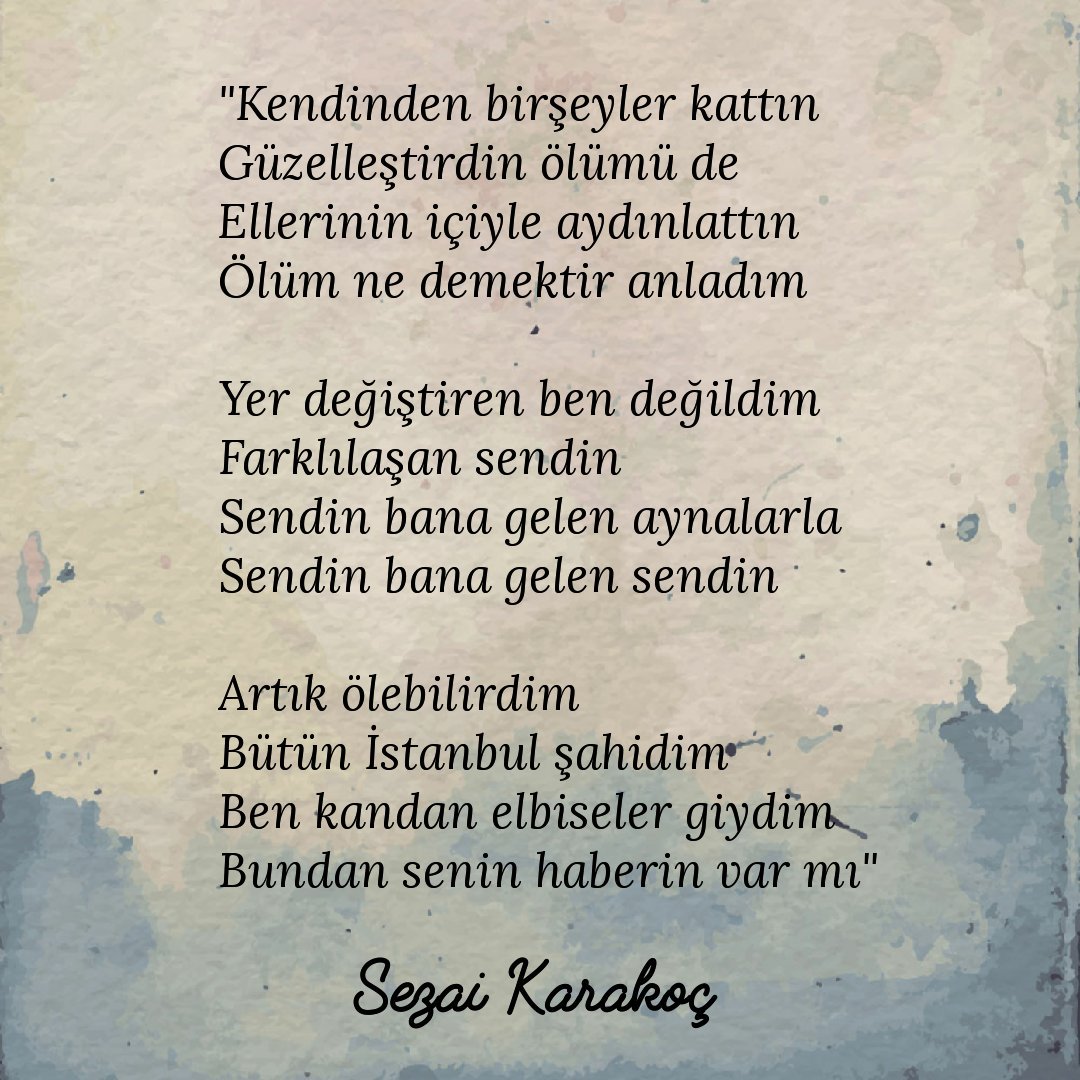 Yine akşam oldu Yalnızlık omuzlarıma çivisini çaktı yine Uzaklık aynı gerçi Her yerdeyken olan uzaklığın pek değişmedi Yine akşam oldu orda olduğu gibi Görebiliyorum seni burdan da Aynısıydı ordayken de. Sezai Karakoçun Şiir Anlayışı.
